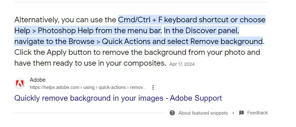 It is absolute insanity to use the word "quickly" in front of the words "remove background in your images" (see below) to describe this process. I've been using Photoshop since 2000. The processes have been made so complex that the directions below read "choose help" from the menu bar. Remove background should be easily accesbile. I'm a full time shooter who makes his living behind the camera, not having to spend 15 minutes researching how to perform a simple remove background. Please create a version of Photoshp called "Independent" or "Full-Time" which makes it easy for full-time, independent photographers (not retouchers) to "quickly" access something like remove background from the menus instead of having to to "investigate" how to do it. These "advanced, search for half-an-hour" methods are great for talented retouchers who only sit in front of a computer most or all of the day. I make my living behind the camera and this is precious time wasted on having to use search enginge, Ctrl+F, Discover Panel and what feels like a 1,000 things to just get to one action. Thank you!