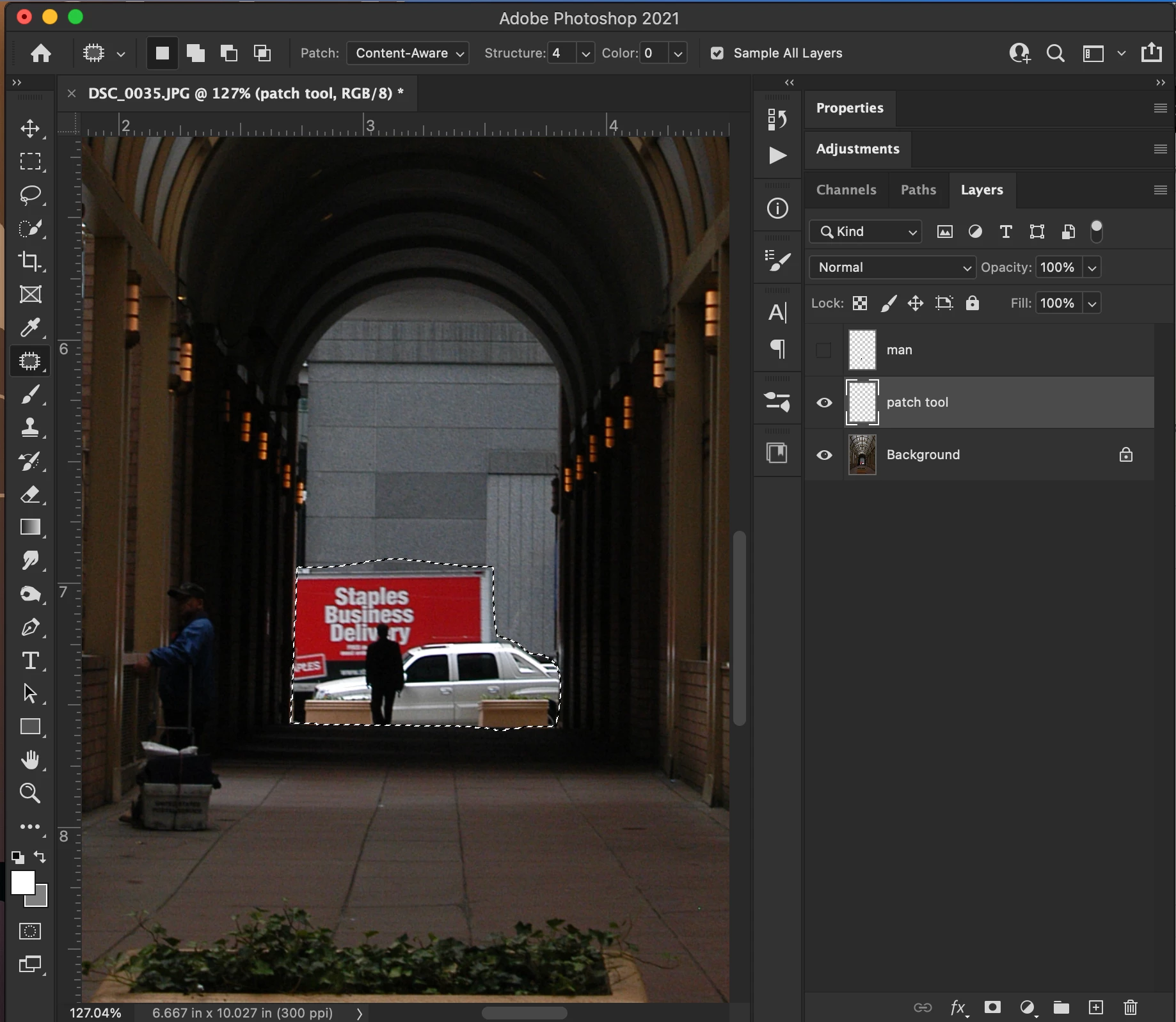 After viewing a number of tutorials, I'm still having fits removing the vehicles from the end of this "tunnel". I'd like to retain the darkened image of the man and have tried to use different selection tools and also Content Aware - Fill to remove him first and then remove the white and red vehicles. My intent was to fill the background with the granite or concrete wall and then return the man to the scene from the saved layer. Clearly I'm lacking the knowledge and experience to pull this off. Any help and guidance would be greatly appreciated.