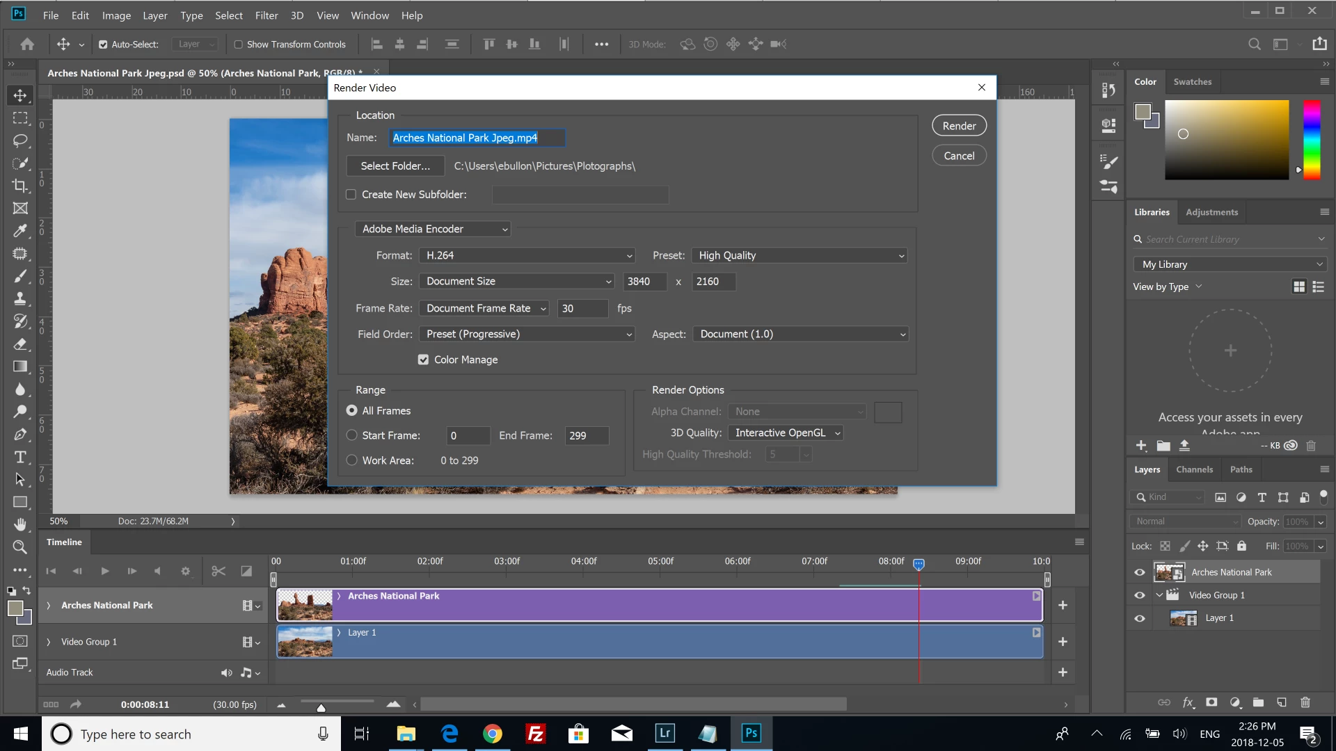Hi, I am trying to render a cinemagraph which consists of a still image and a video. Both of them are high quality and look good to start with. After combining them in photoshop and rendering to video, the video quality is horrible.