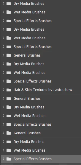 Thank you for posting an image of the brush panel that looked exactly like mine. I had all the categories (Dry media brushes, Special effects brushes etc. etc.) listed multiple times and spent a lot of time deleting them manually. I have little understanding about how my brush panel got into this state, so I assume it will happen again and again.