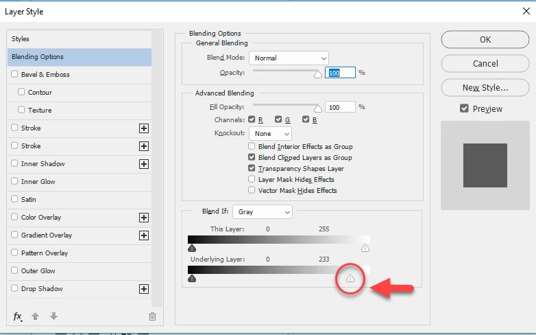 3. In the dialogue that opens move the "Blend If Underlying layer" slider arrowed below to the left slightly