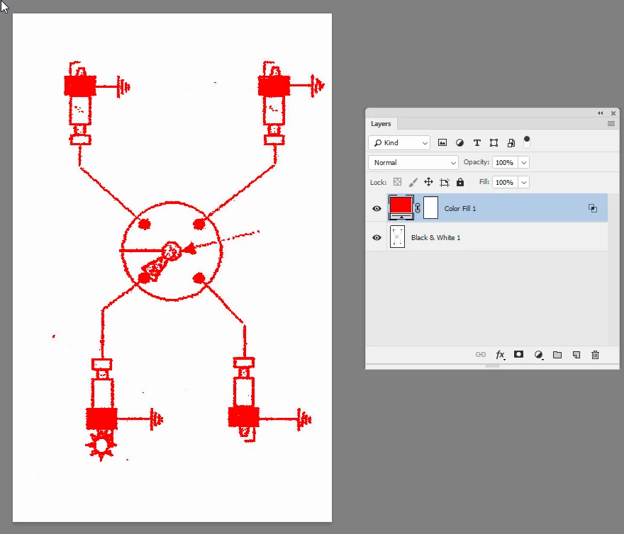I finally did what I usually do, figured out a work-around that satisfied my husband who wanted this part of his wiring diagram to be in red. I used the color replacement tool and went over the black to give me enough red that it works. I also used the magic wand and the paint bucket for the larger areas that needed to be turned red. Again though, I figure there must be a way to turn all of the black to red…