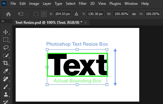 How can I resize a text layer based on the actual glyph bounding box (without converting it to a smart object/shape)? If I want to resize the text, Ps uses the text layer bounding box to calculate the size.