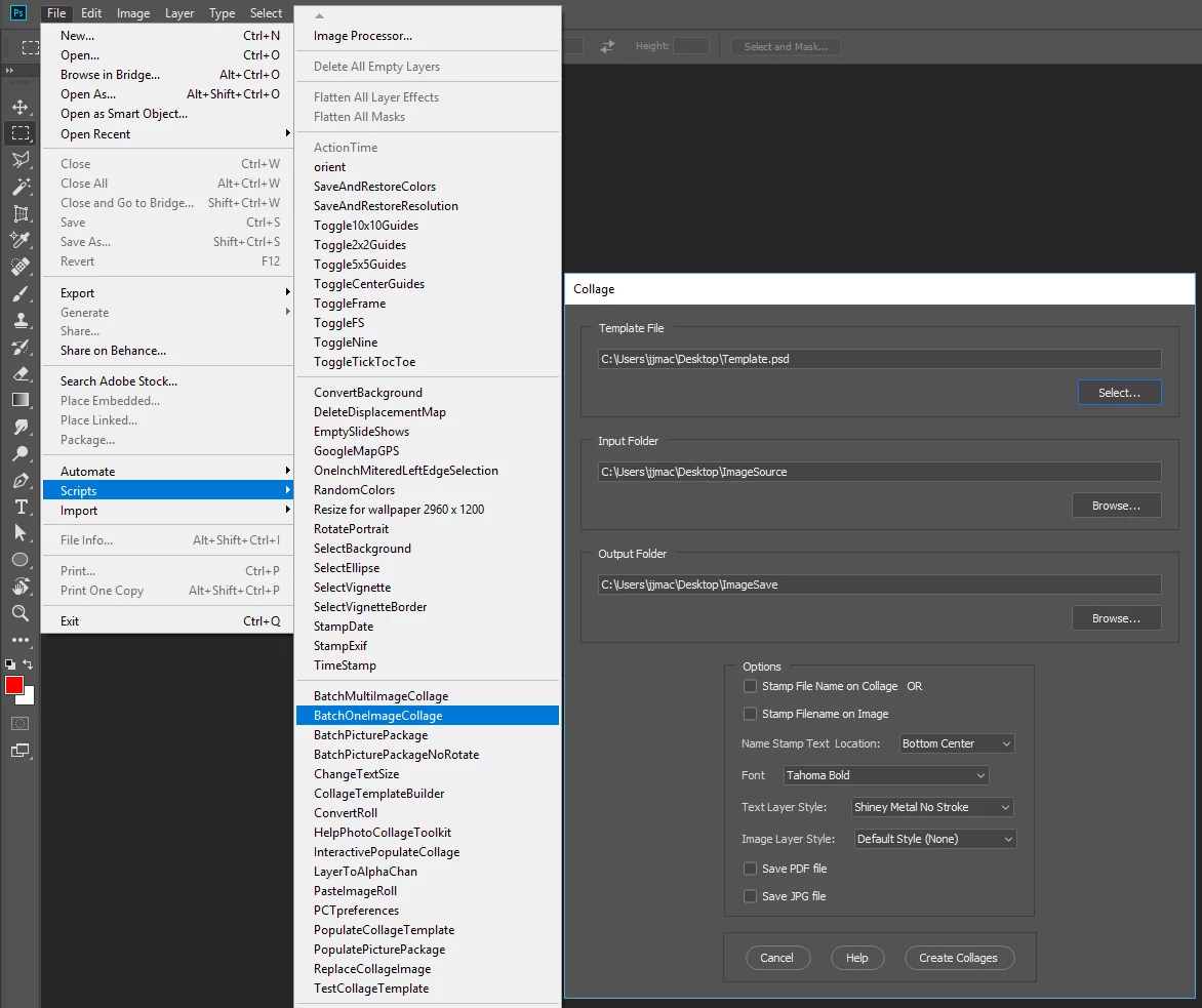 9. BatchOneImageCollage.jsx - Used to Automatically Batch Populate Collage templates that only have one image inserted. The Collage or Image may be stamped with text.