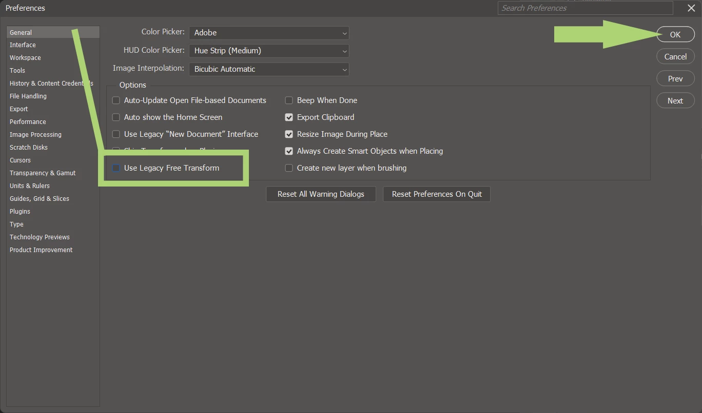 Anyway, go to Preferences panel > General > Check the box to Use Legacy Free Transform.