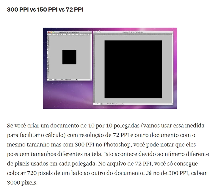 If you create a 10 by 10 inch document (we'll use this measurement for ease of calculation) with a resolution of 72 PPI and another document that is the same size but 300 PPI in Photoshop, you may notice that they are different sizes on the screen. This is due to the different number of pixels used in each inch. In the 72 PPI file, you can only fit 720 pixels across the document. At 300 PPI, 3000 pixels fit.