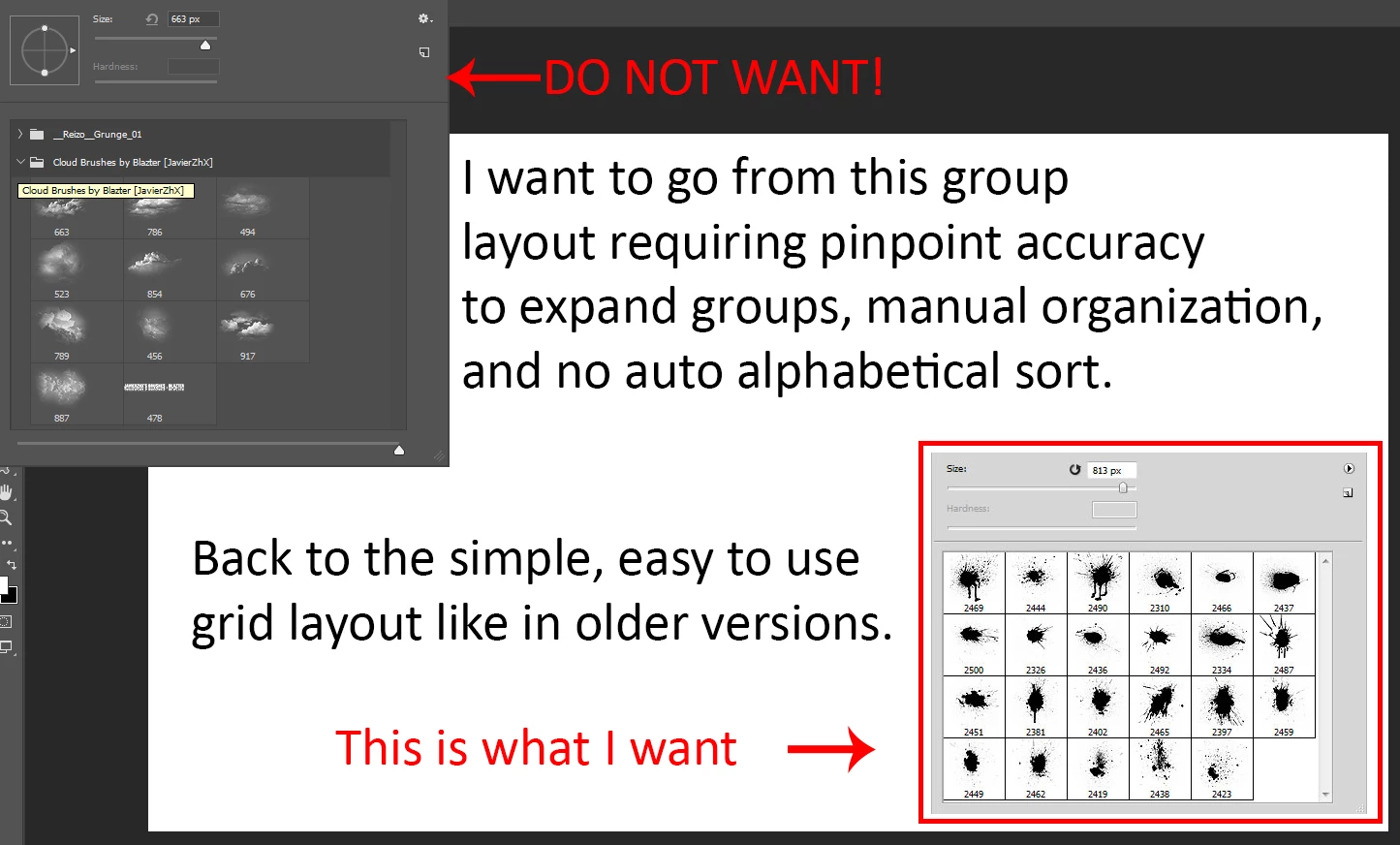 Is there a way to restore the brush panel to the old version where all the brushes are in a grid rather than in the annoying "groups"? I've been searching for hours on blogs, forums, and videos trying to find out how to do it. I've seen a few moderators from the community forums here say there is a way, but none of them actually said how to do it or provided a useful link to the answer. So, how do I go back to the old panel? Am I just S-O-L?
