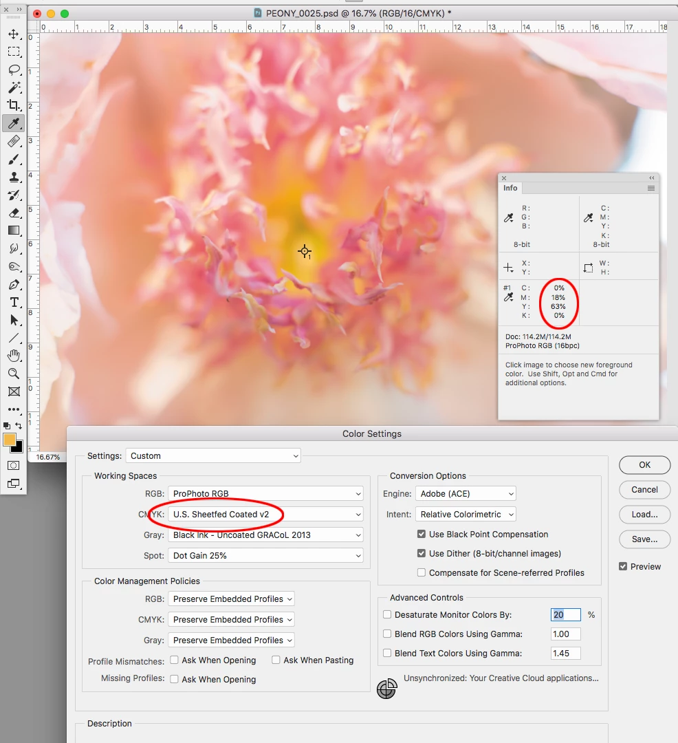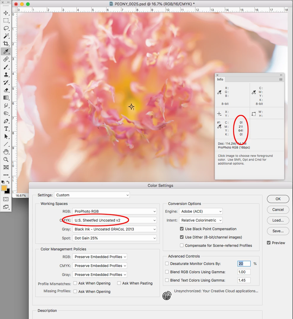 Also, I notice that in some files, my corresponding CMYK colors are represented as percentages; however, in some files, CMYK values are followed by an exclamation point. Again, I have no idea what that means.