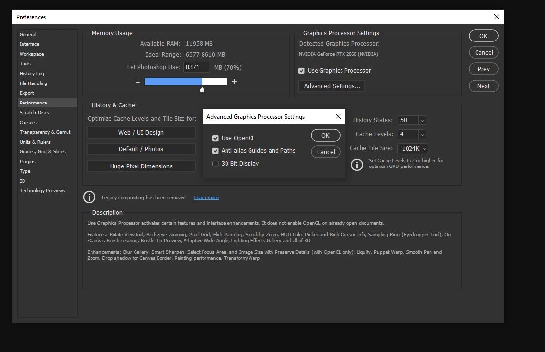 Can you make sure all your monitors are plugged into the NVIDIA GeForce RTX 2060 and you have the high powered graphics selected (see step 7 here in troubleshoot) https://helpx.adobe.com/photoshop/kb/troubleshoot-gpu-graphics-card.html