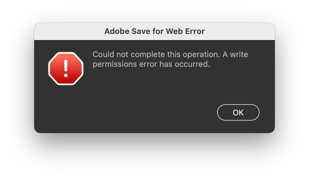 When I try to export an animated GIF through 'Save for Web' I get the error msg 'Could not complete this operation. A write permissions error has occurred.' I'm on the latest version of Photoshop 2023 (v24.0.0 and my Mac is on Ventura (13.0). But I've had an error msg whilst performing this operation on older Photoshop versions, older OS versions and even on other Macs.