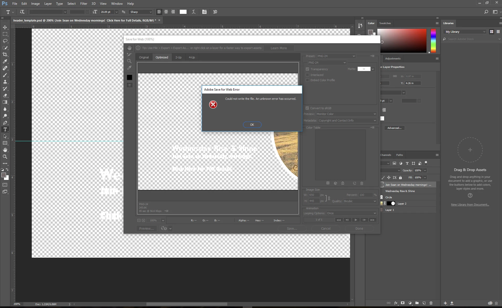 I edit the image, go to save for web (PNG24, with transparency) and get this error no matter what I do.