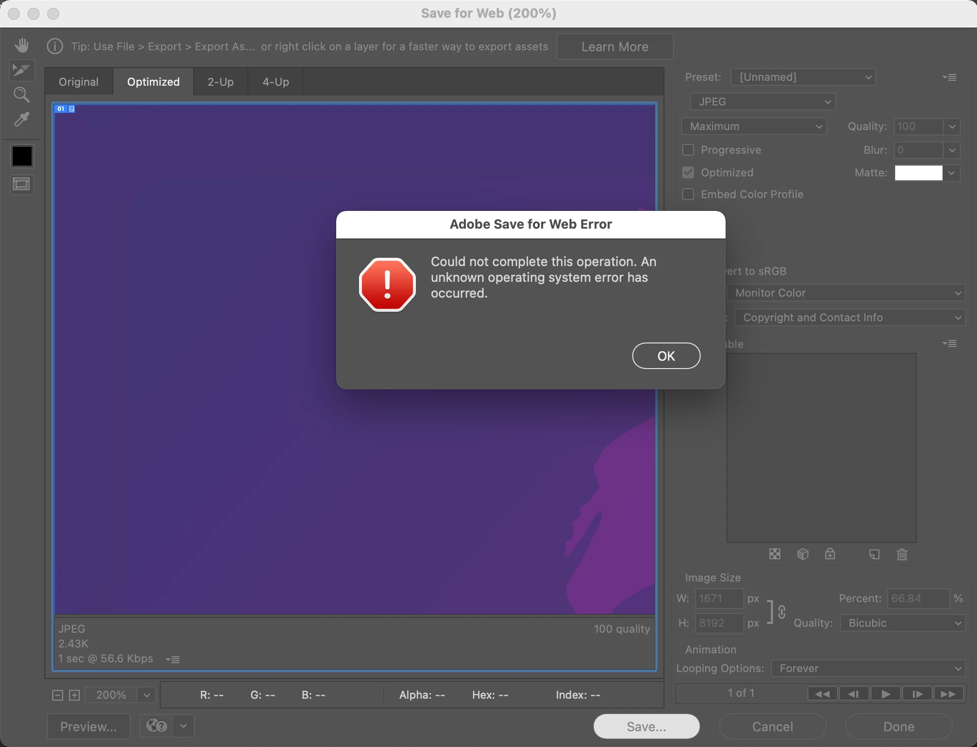 MMalli5EF3ParticipantForum|Forum|4 years agoJuly 8, 2021QuestionSave For Web Error in Photoshop on macOSForum|Forum|4 years agoJuly 8, 20211 reply205 viewsMacImport and exportPerformanceProblem or error