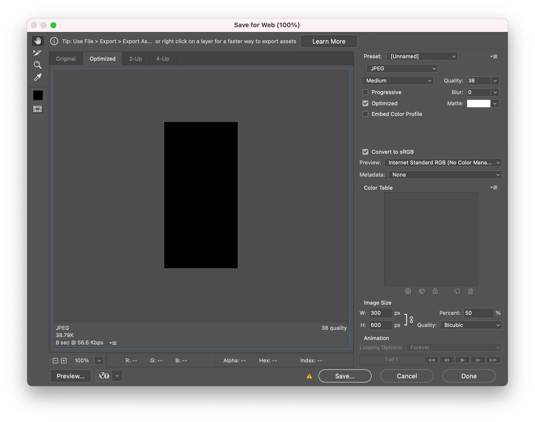 I'm using Save for Web in Photoshop to export a static backup for banner ads, keeping the file under 40K. In Photoshop, the file size shows as 38.79K, but after saving, Finder on my Mac reports it as 53K. This discrepancy is unusually large, and Save for Web has always been accurate for me before. I'm not sure why it's suddenly off. I'm using Mac Photoshop 2024 (v25.11). I've also tried this in a newer version of Photoshop and experienced the same issue. I've covered the original creative with black in this screenshot as to protect the proprietary content.