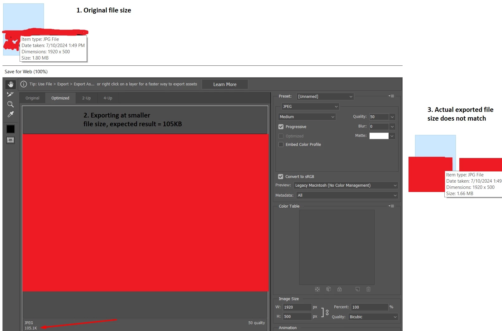 I have a JPG image with file size 1.80MB. I'm trying to reduce that size via Export > Save for Web (Legacy) > lowering quality to Medium, which the dialog window says will yield file size 105KB. But the actual file size after export is 1.66MB. Screenshot included, image blocked out for privacy. The file was created on a Mac then sent to my Windows device.