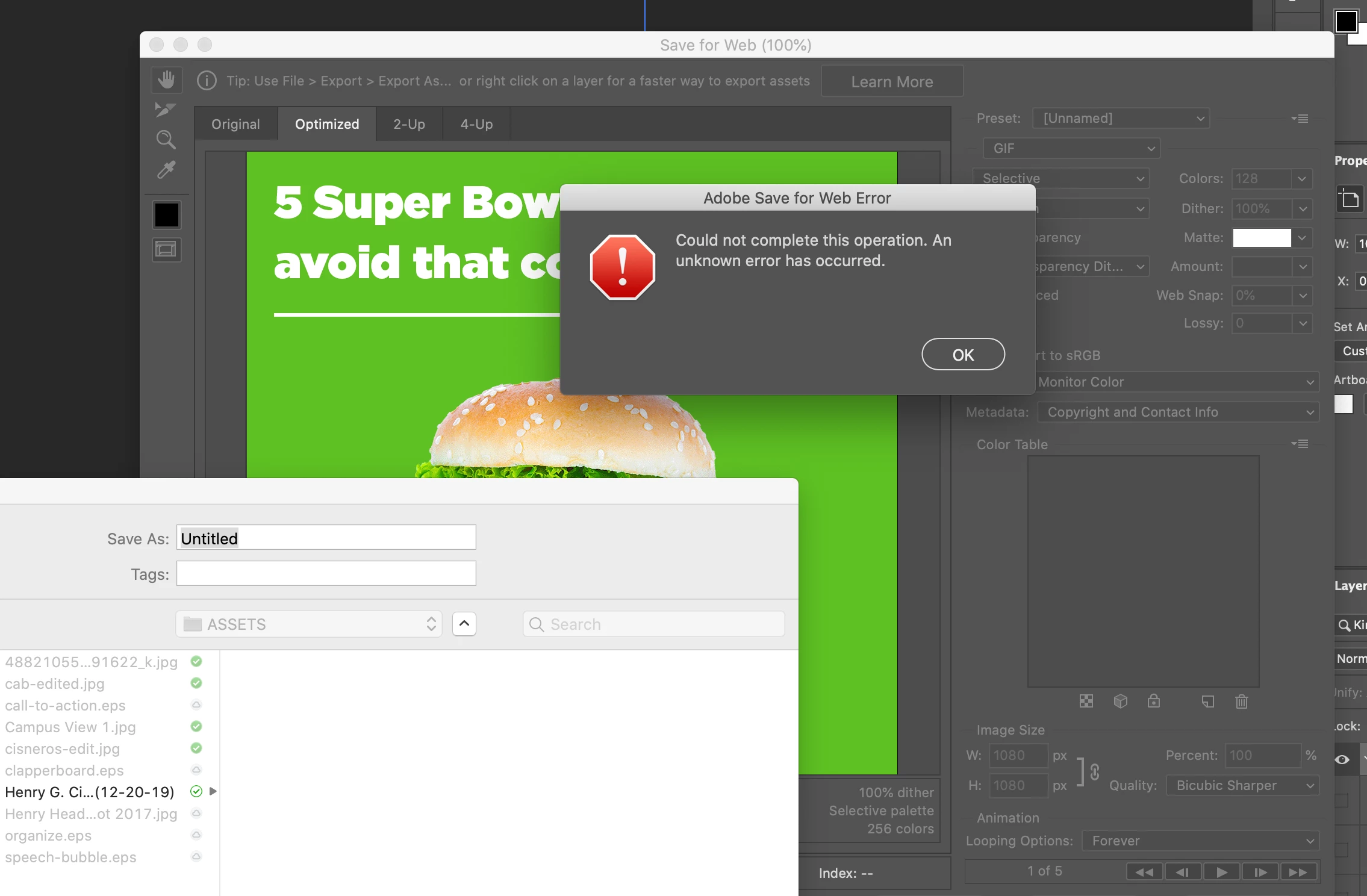 Save for Web Legacy unknown error in Photoshop