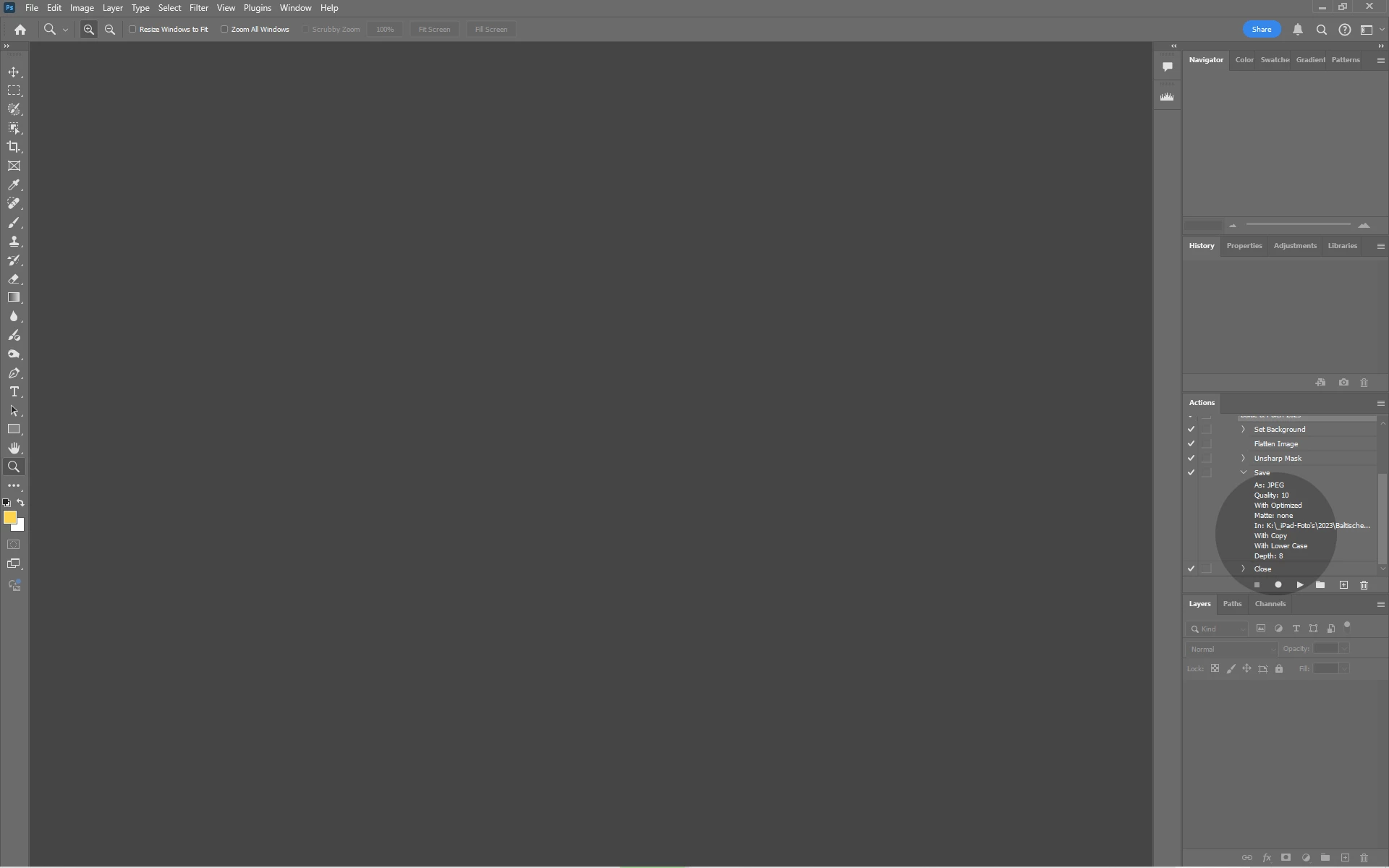 I make the following Action: Unsharp Mask 22% - Save as JPG - Quality 10 in K:\2023\Pictures Estland\ - than 'Save' and 'close'
