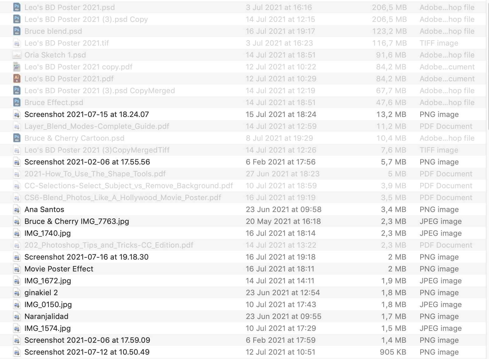 Hi, Wherever i have saved my PS documents they are irretrievable because they are greyed out. This screenshot is an example of a selection of things saved to my desktop . I have saved Leo's birthday poster in a multitude of different formats and they are all greyed out, so i cannot select them. The same is the case for PS files saved in the cloud or anywhere else for that matter 😞 Hope you can help.