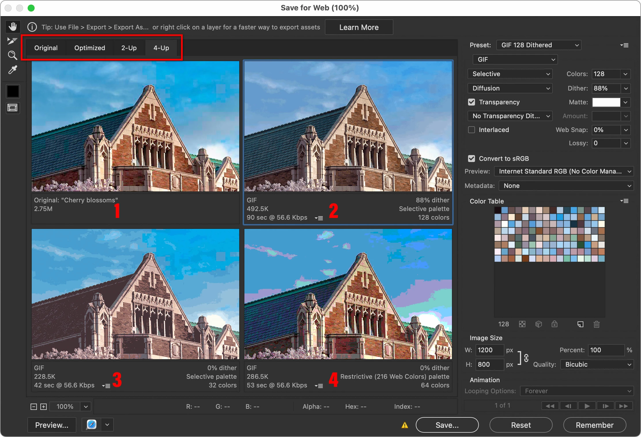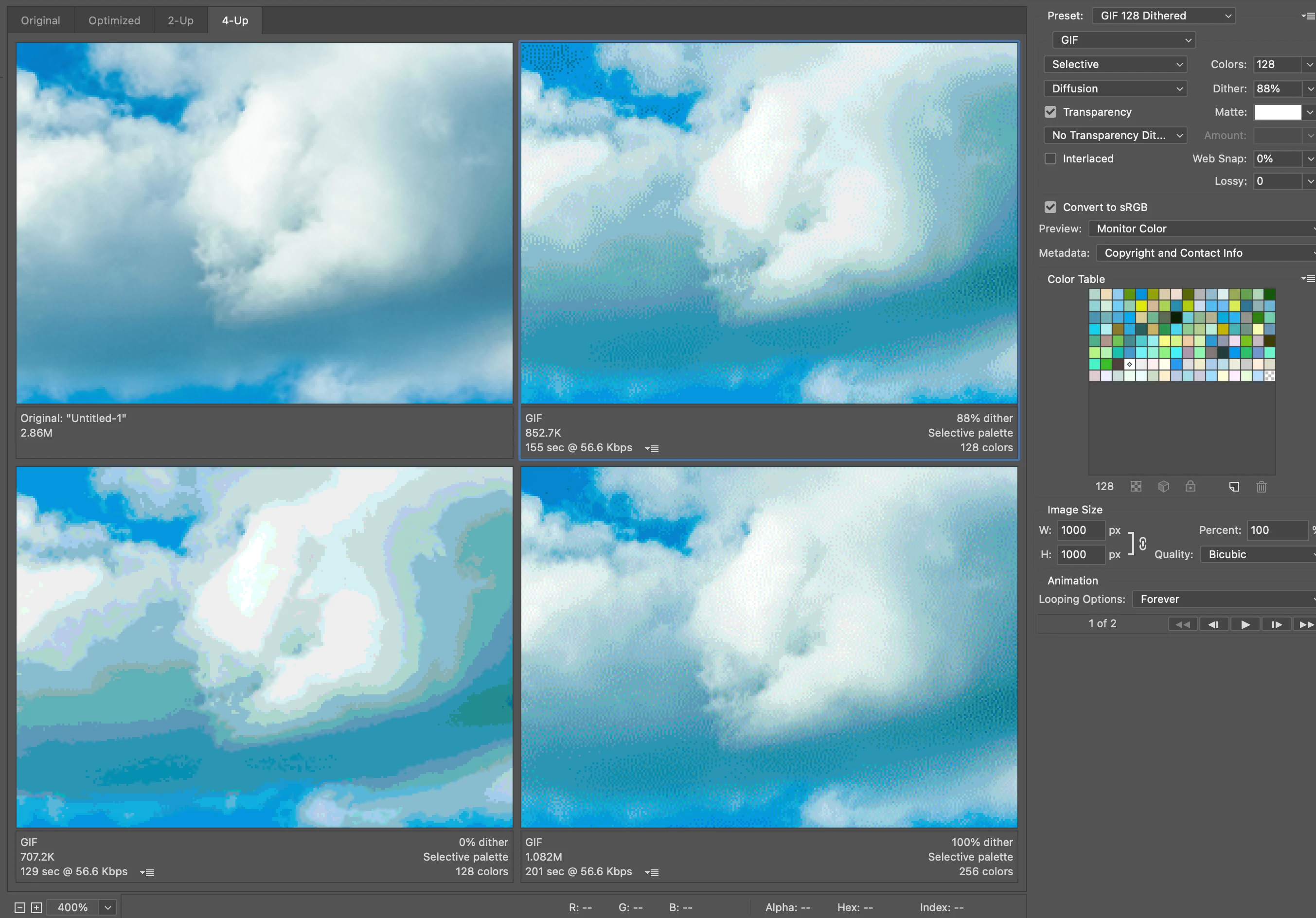 In the picture below, I have set it to 4-up view, which lets me compare the Original to three alternate combinations of GIF settings to help me decide which one will make the image look the best. There is a blue line around preview 2, meaning it’s selected, so the settings in the panel in the right represent that preview. You can see that this makes it easy to figure out that preview 2 looks OK, and preview 4 represents a much smaller file but looks terrible.
