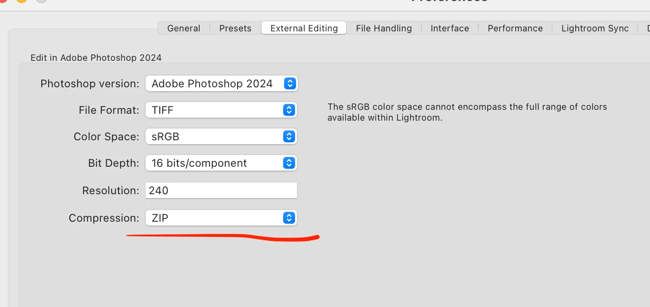 This is even in Lightroom Classic, external editing tab, has the TIFF ZIP compression turned on.