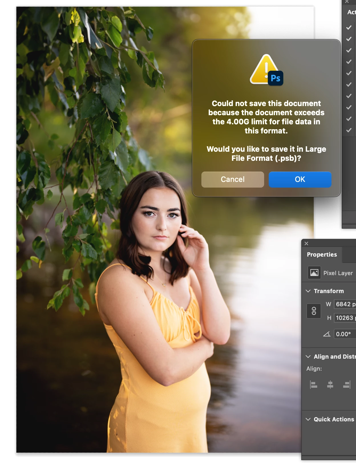 And then, I tried to replicate the TIF saving issue where it exceeds 4GB, and when I attempted to save it as uncompressed TIF with uncompressed layers it did the same error, suggesting to save as PSB.