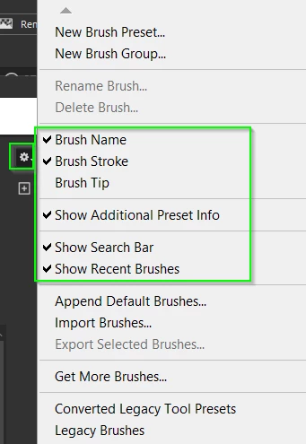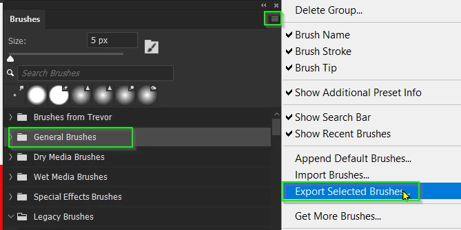 Note Export Brushes will be greyed out if no presets or group(s) are selected.