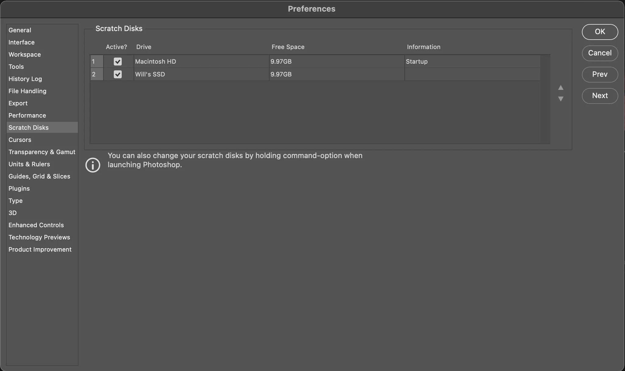 Below are some screenshots of what Photoshop is telling me about the scratch disks and what my OS is telling me about them.