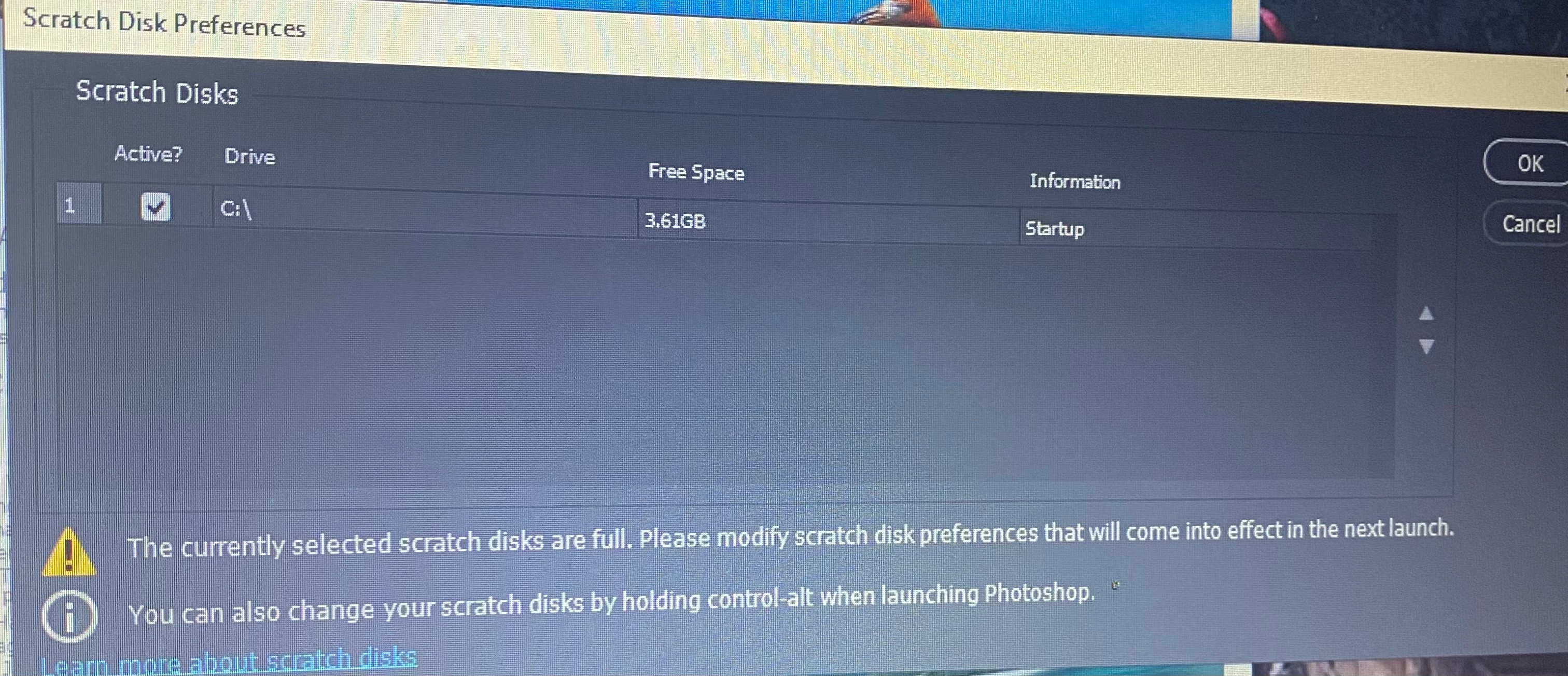 Any help would be greatly appreciated. When launching photoshop 'scratch disk pretences are full' launches and when pressing ok shuts down photoshop. This means I can't change preferences within photoshop. I have tried clearing files. Holding the alt/ctrl/alt button (on a windows pc) and nothing is working. Please help!