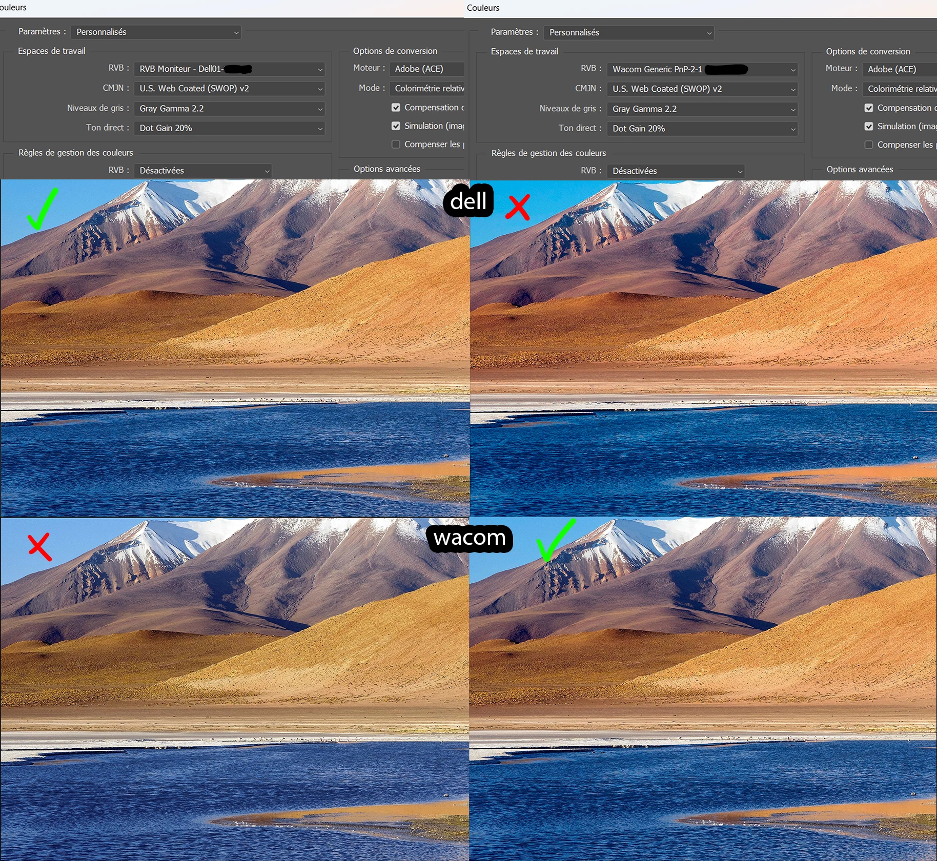 When I have selected the dell profile the colors are good on the dell but not on the wacom and the reverse is also true.
