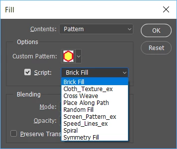 Under the Edit menu, select "Fill" and use Pattern for contents, and click on the Script box. Then Select the type of fill you want from the drop down list.
