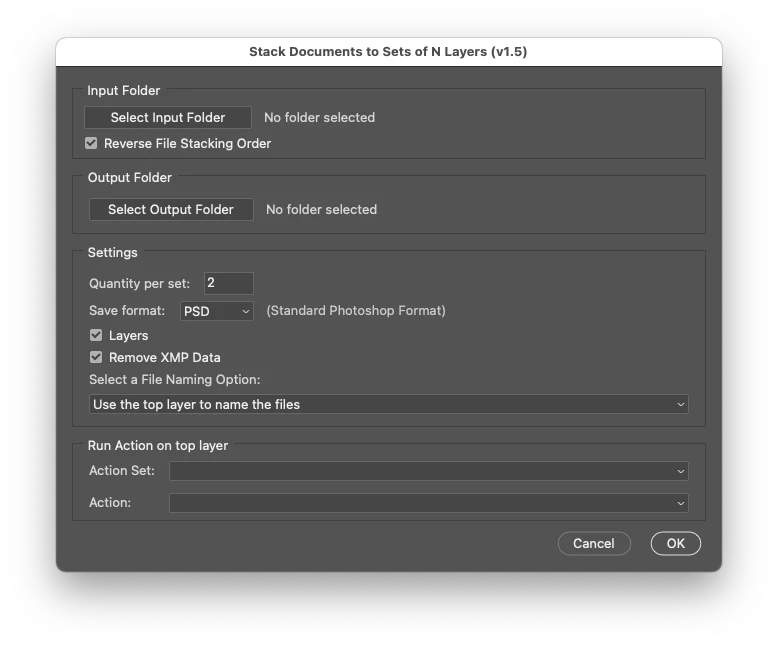 A minimum of 2 or more files per stack is required. The quantity of input files must be evenly divisible by the stack quantity.