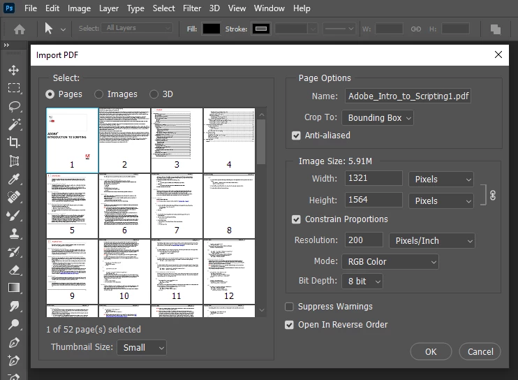 I'm scripting for PS and am getting some problems because some of the PDF files I need to process are being opened as images (no dialog asking PDF details). Now I'm trying to figure it out and am opening manually. I have two PDF files. One of them Photoshop opens as expected (showing the dialog). The other one, which is giving me problems in script, opens directly.