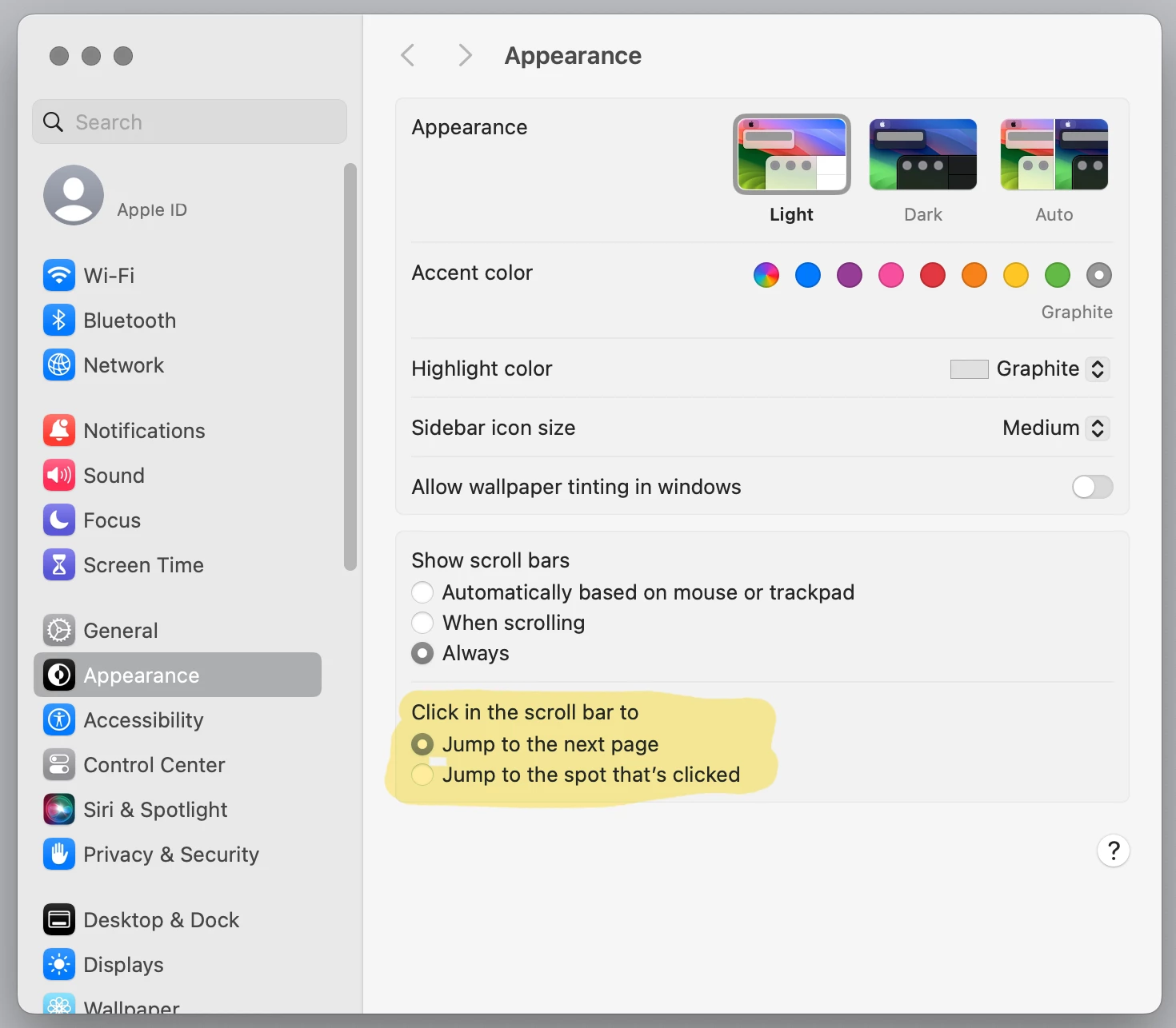 I recently upgraded to a new Mac, with the new OS Sonoma 14.4. In the past, in Photoshop, when I clicked on the scrollbars, the image jumped to the next adjacent section in the image. But now, when I click on the scrollbars, the image jumps to wherever I happened to click in the scrollbar instead of just to the next section in the image. If I hold the Option key while I click the scrollbar, it works the way I want it to work, by only moving the image to the next section. I do not want to have to hold the Option key every time I click on the scrollbar. How do I change this back to the scrollbar only jumping to the next image section instead of jumping all the way to wherever I happened to click in the scrollbar?