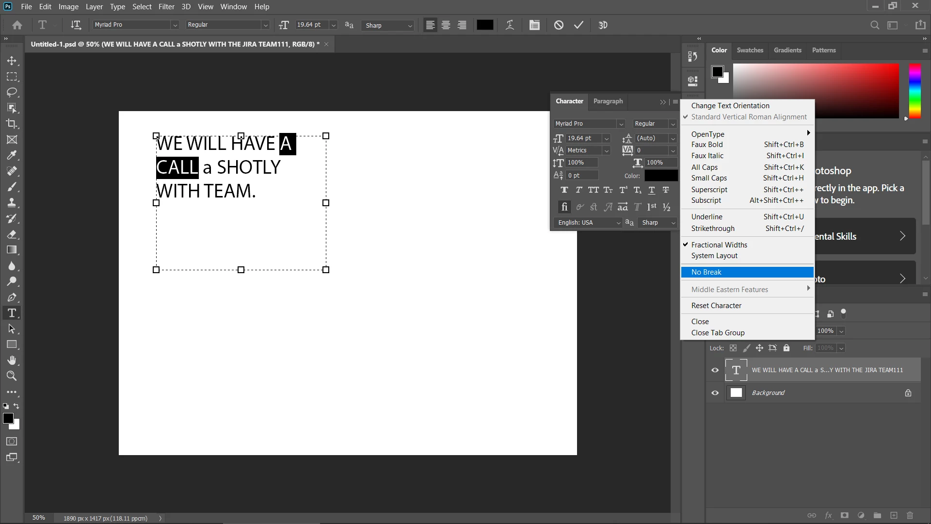 Please anyone give idea to apply no break for a letter at the end line in photoshop using javascript.