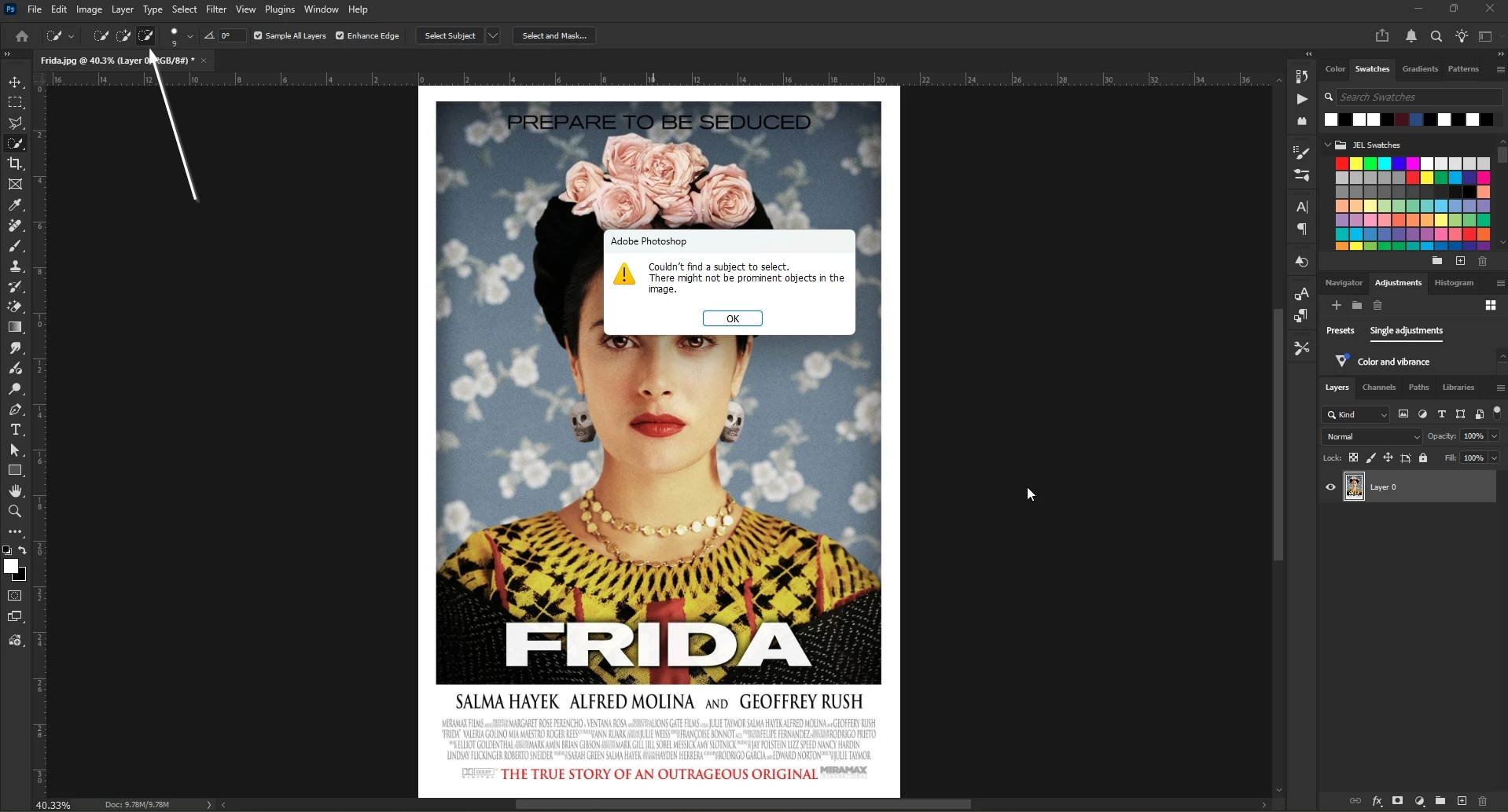 I just updated from Photoshop 2025 to Photoshop 2026 (27.0.0). If I want to use the tool Select Subject, a loading bar appears, but shortly after it says "No subject found, that could be selected" (self translated from german language). It's happening with all images, even if the subject is very clearly visible. What's happening? Is this a bug?
