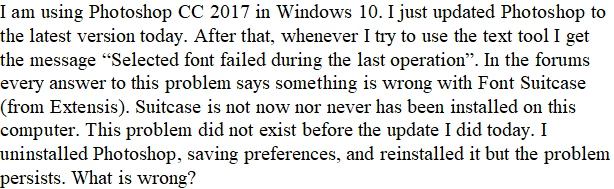 The error message appears immediately upon clicking in the image with the text tool. Every time I try to select a different font, the message renews itself. I have never used an external font manager and I have been using Photoshop since v2.5.1 and I purchased new versions about every other version. What is that ... 20 ... 30 years? I don't know, but it seems like forever. I have updated this instance of Photoshop to revision 2017.1.1, the version available today. My laptop computer has the same revision of Photoshop and it doesn't display this issue. On the problem computer I have two word processors: MS Word and Lotus (now IBM) WordPro. Neither has a problem with fonts. On the same machine Illustrator CS6 does not have problem with fonts. How can this be a problem with the OS?