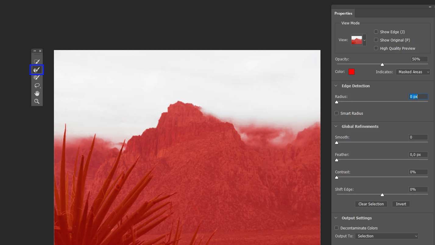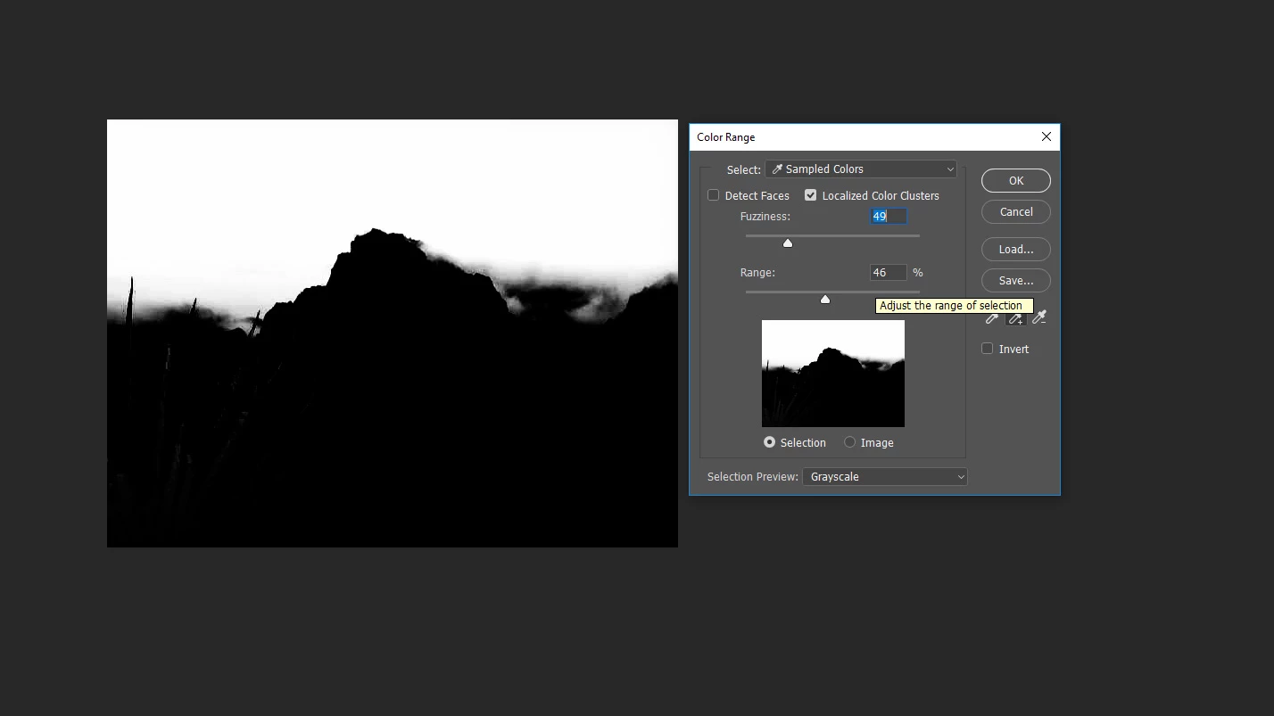 My first challenge, which I hope you can advise me on, is selecting the clouds. This might be a bit of a newbie question, but my difficulty is where the mountain is partially visible through the clouds. How can I select the cloud, select the whiteness of where the mountain shows through (i.e. I'll want to increase the contrast of the white cloud without increasing the contrast of the mountain that is partially visible through it), and avoid any sharp edges in the selection?