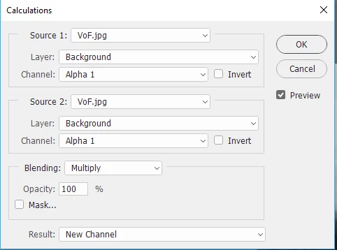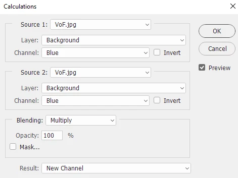 2. Go to Image - Calculations and set it up to multiply the blue channel by itself and output  to a new channel