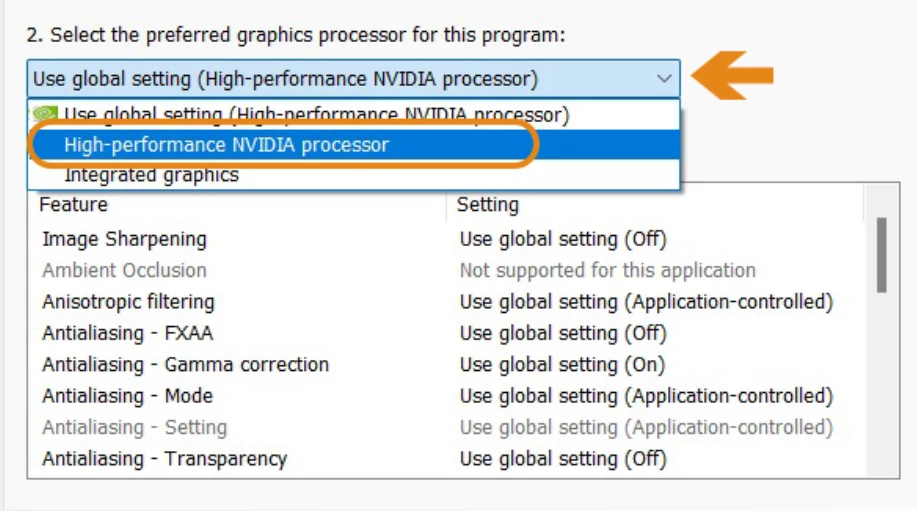 ❺ Change the preferred graphics processor to the High-performance NVIDIA processor & click on Apply.