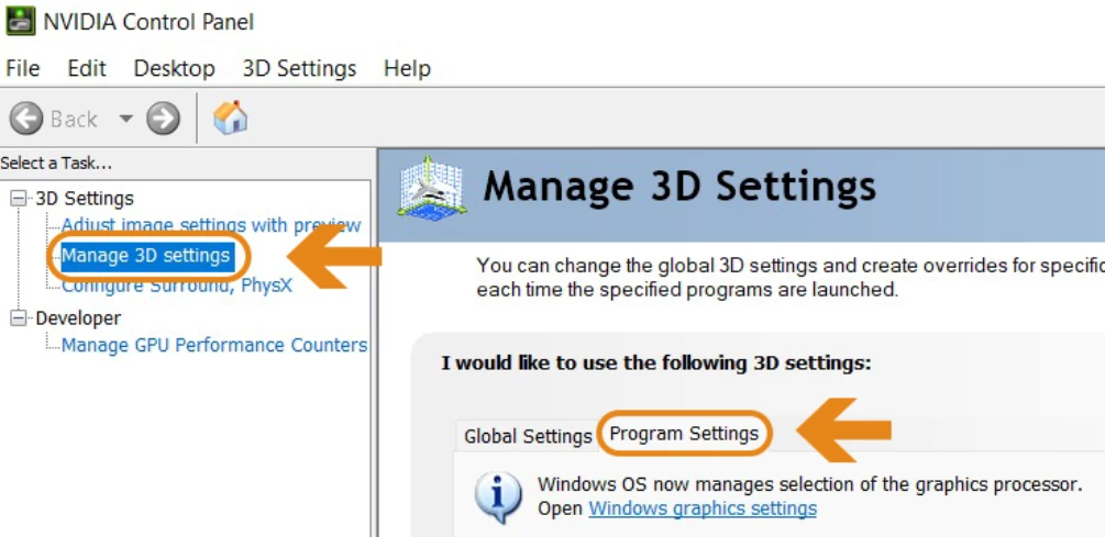 Click Manage 3D settings > Program Settings