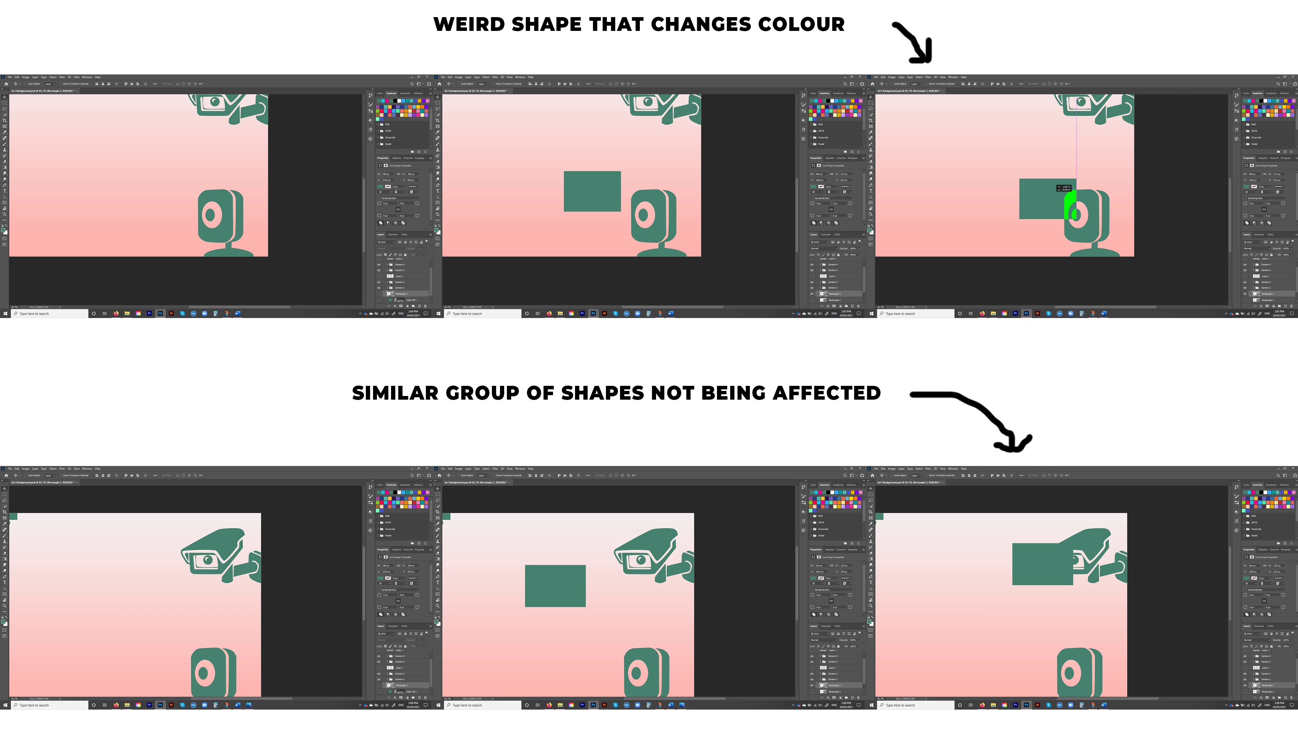 In the screenshot, the top pictures are of the shape changing colour as I drag a rectangle over it, the bottom pictures are a similar group of shapes not being affected at all.