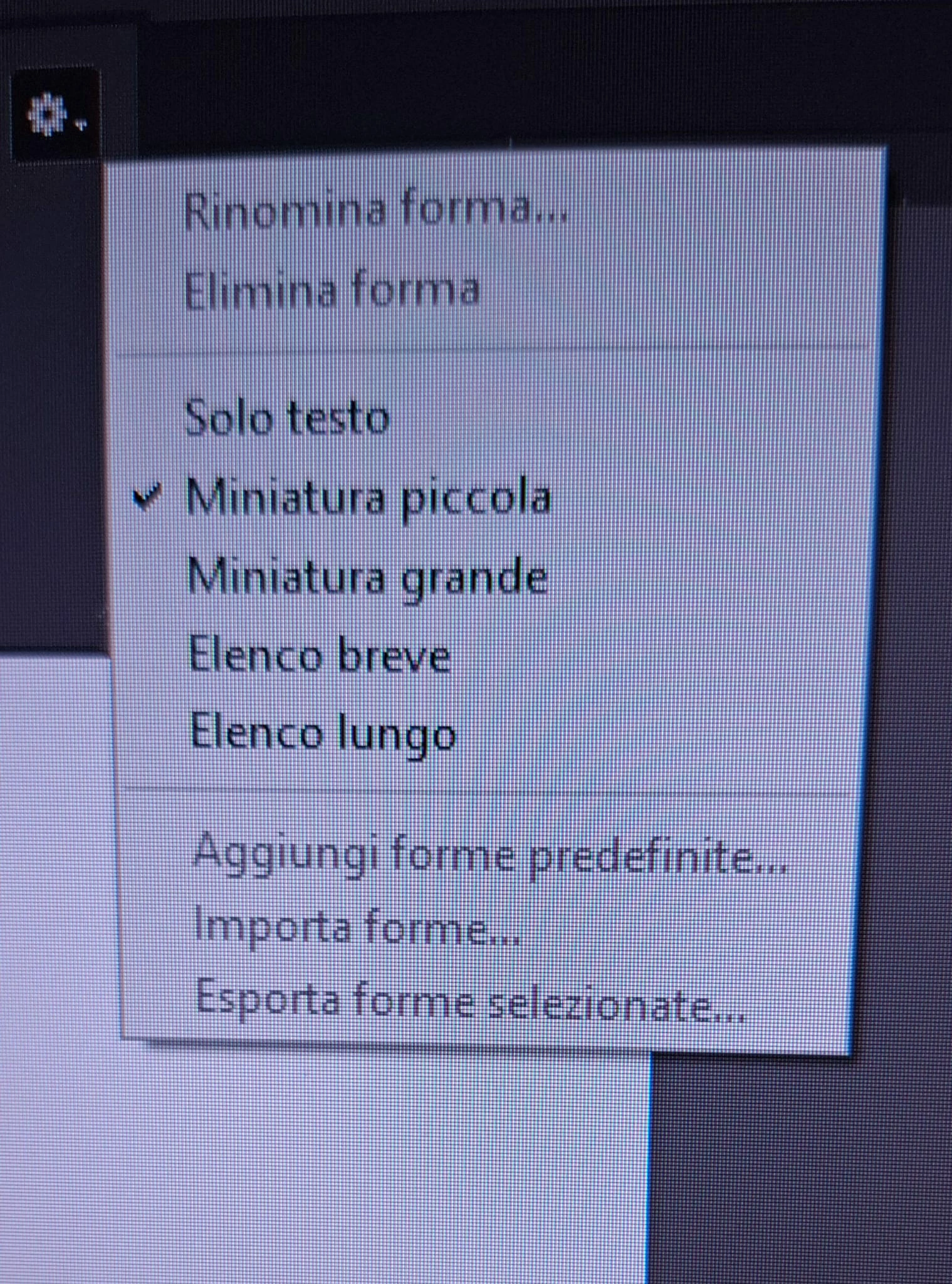 Sto utilizzando Photoshop nella versione 25.12.3. Ho necessità di importare delle forme ma quando vado nell'apposito menù la funzione "Importa forme" non è attiva. Allo stesso modo non sono attive le funzioni: Aggiungi forme predefinite, forme Esporta selezionate, Rinomina forma, Elimina forma.