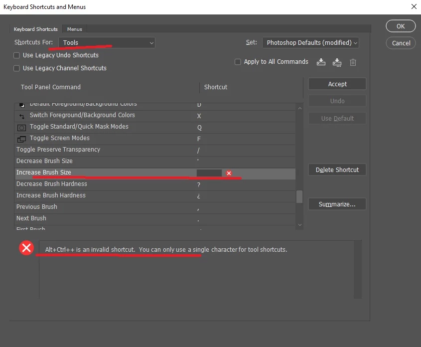 Every time I try to set the "left square bracket" and the "right square bracket" on my keyboard... photoshop tells me error message: "Alt+Ctrl+ + is invalid shorcut"