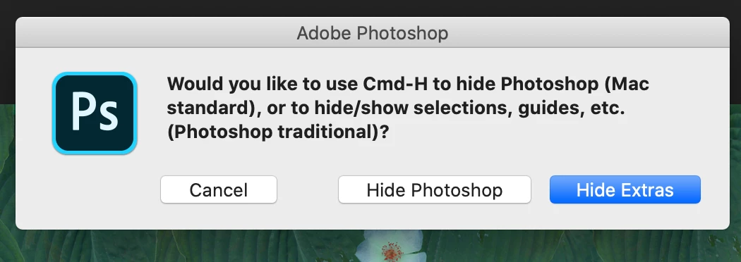 I have for years been using the short cut Command H to hide a selection I am workingon, repeat to return selection, this does not now work and instead hides the whole image hbow do I return this function please ? Photoshop 2020 21.1.3