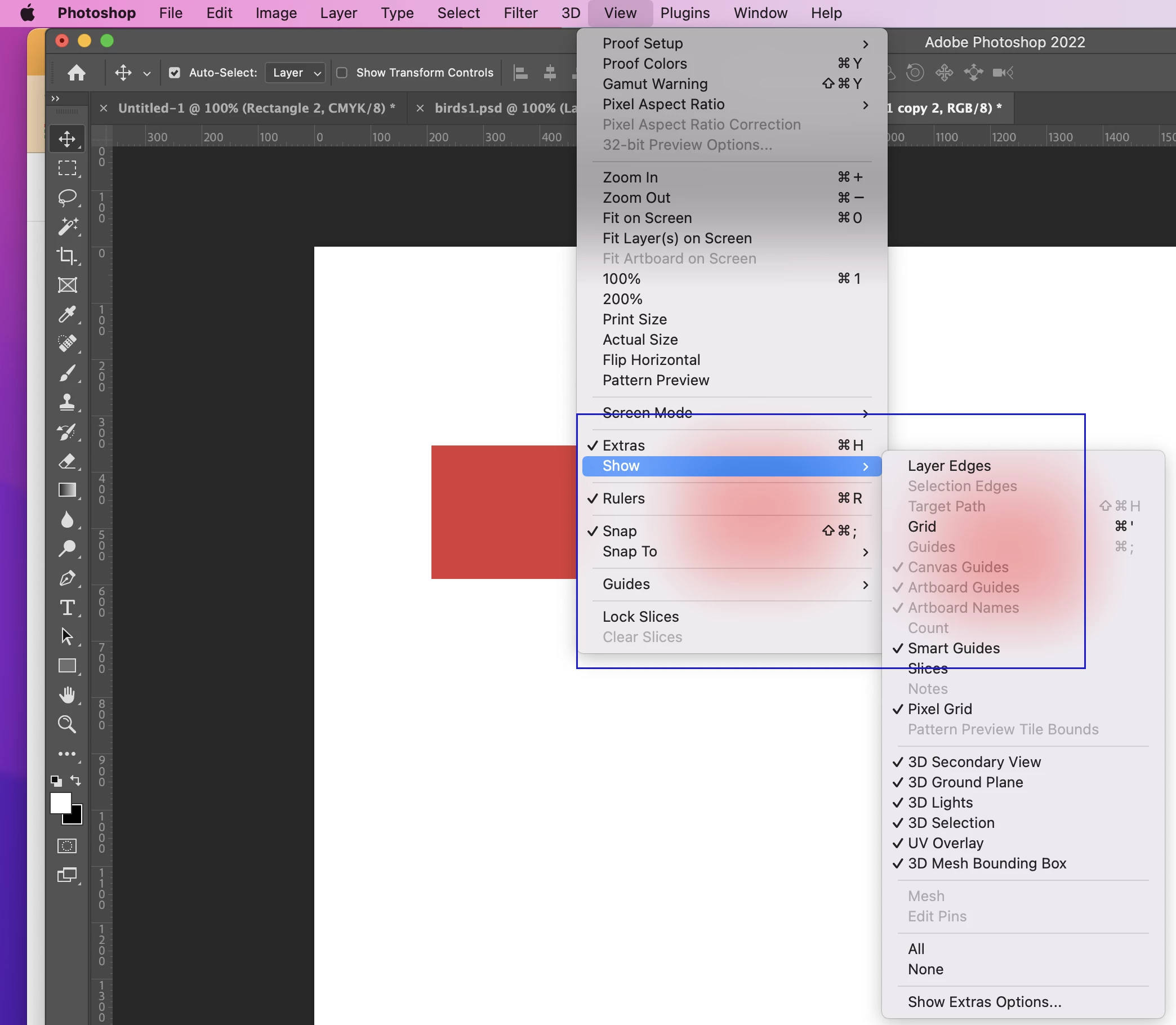 So we're talking about very basic Photoshop feature here. Adobe's article on Smart Guides (https://helpx.adobe.com/fi/photoshop/how-to/align-space-objects.html) is not helpful at all since those features do not appear on my device.