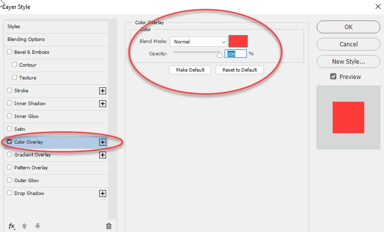 Check Color Overlay and click next to it to get the Color Overlay controls.