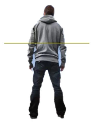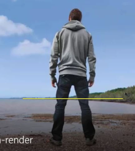 Look at the shoulders of the figure. You don’t see the top of the shoulders. It looks to me like eye level is around the figure’s waistline or closer to his knees below. If you stand behind someone who is about your same height you will see the top of their shoulders because your eyes are above that.