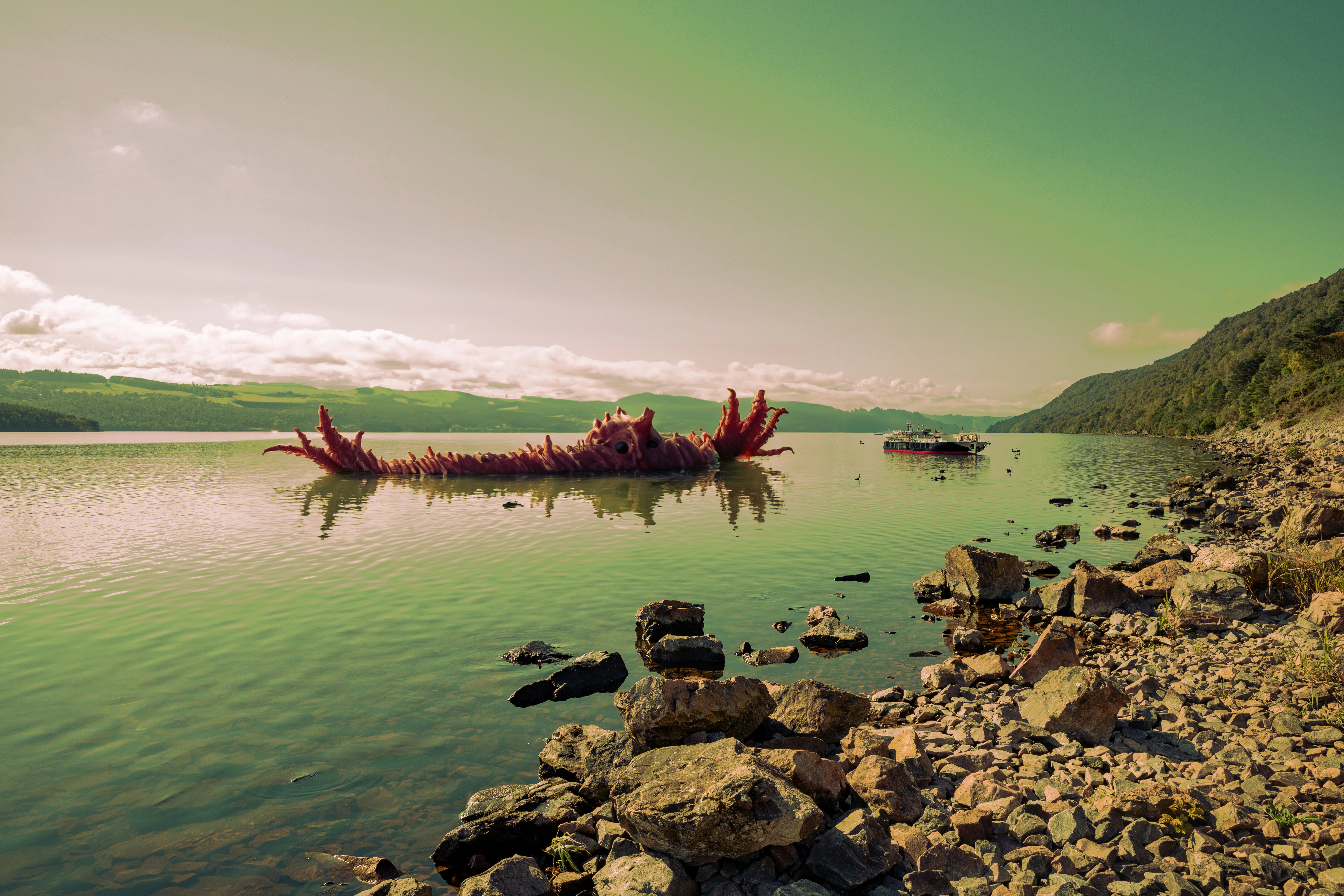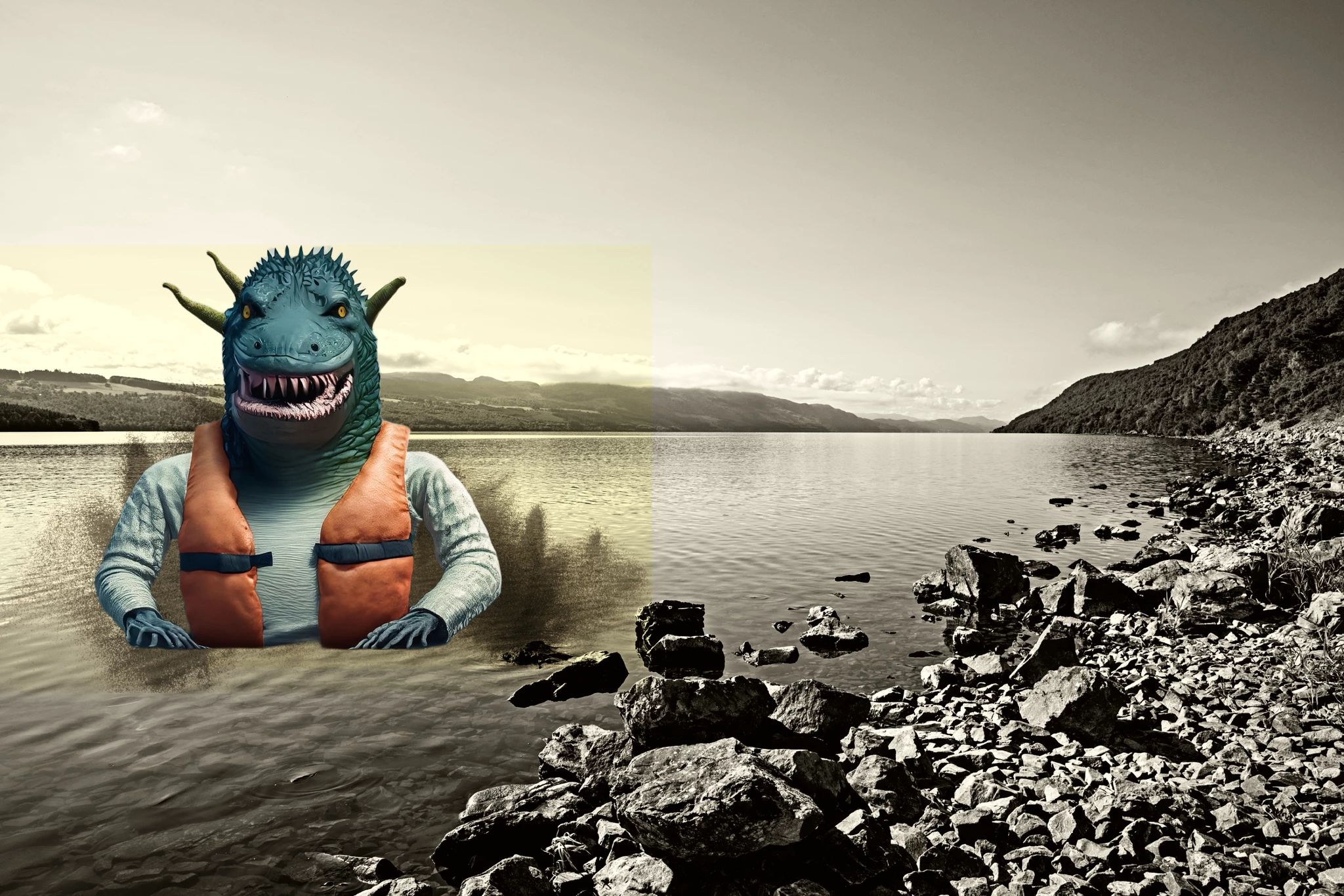 Welcome to SFTW Chezier. That's a nice job with the image, recolouring the foreground rocks helps keep the atmosphere throughout. I always thought it would be nice to have a house on the banks of the loch, but maybe not with that monster at the foot of the garden!