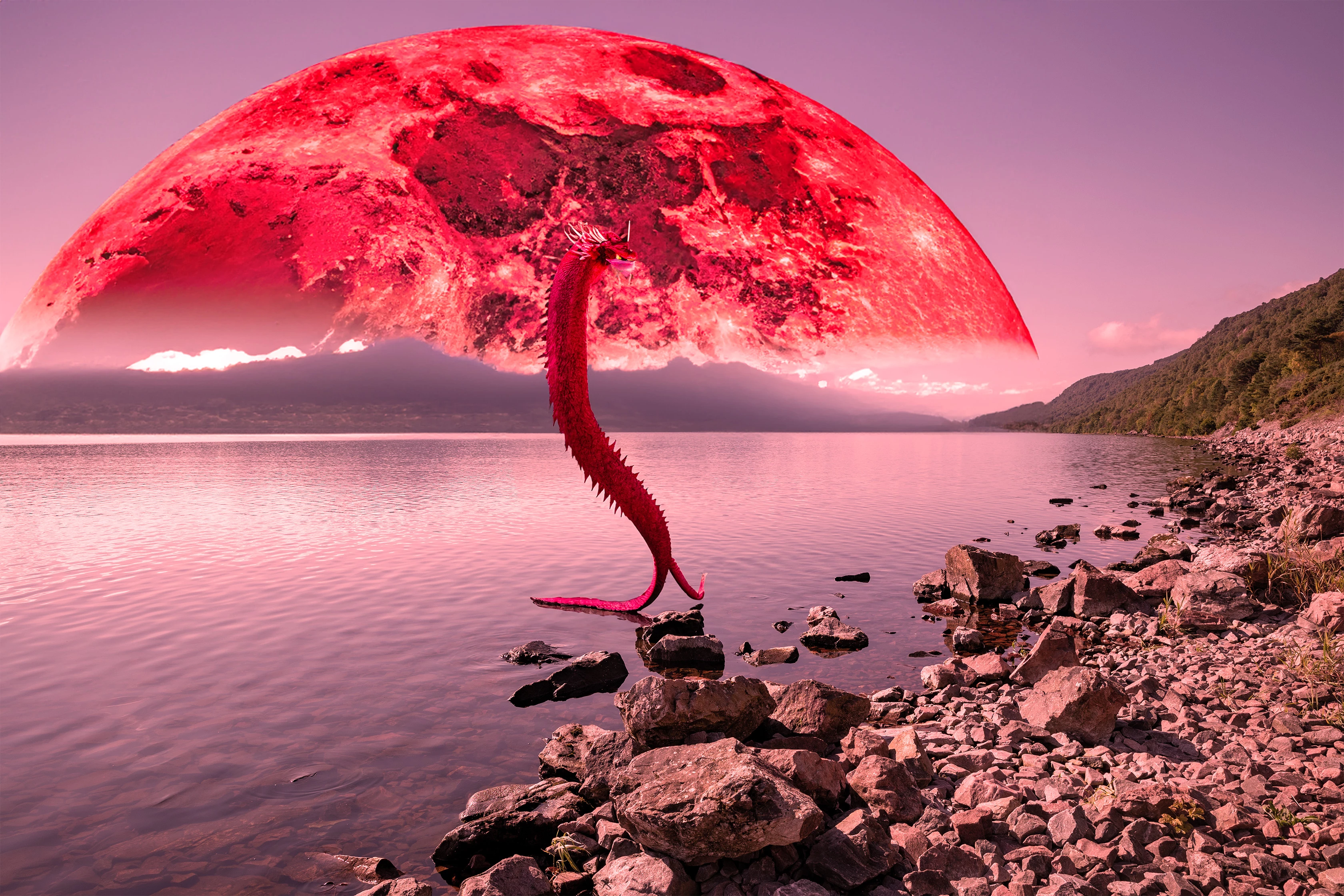 1.  The serpent's connection to the water is flawless.  The reflection disappears behind the rock, and the tentacle camera-right is clear of the water as indicated by the reflection.  If this was done manually, it is very impressive, and if it is Ai it's also very impressive, but for a different reason.