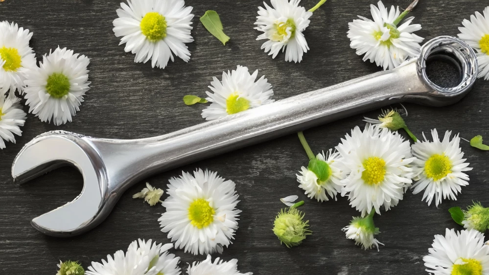 Welcome to SFTW Ellie. Is that the same spanner - it appears to have been transformed 🙂 I like the reflections of teh flowers in the edges.