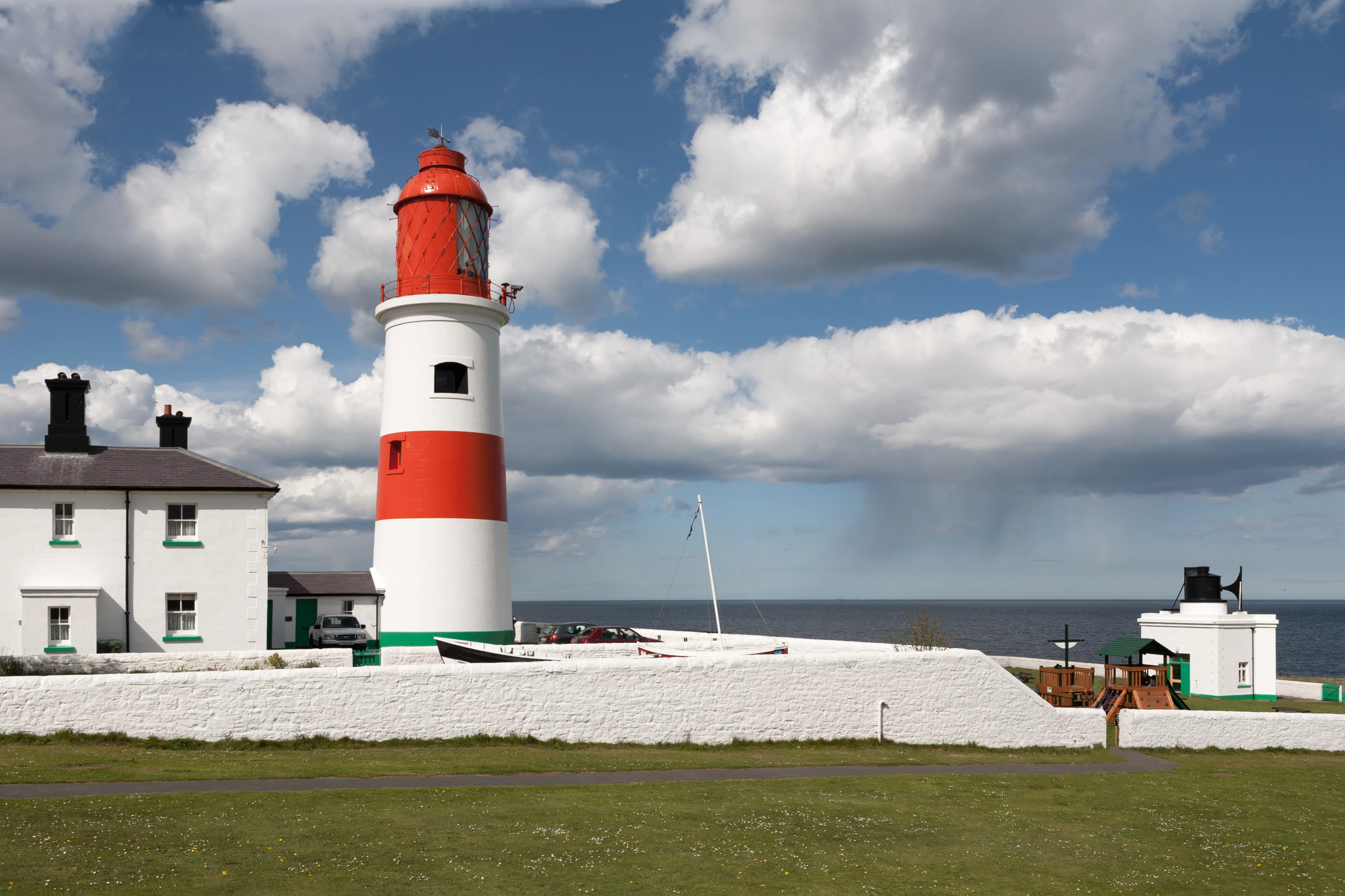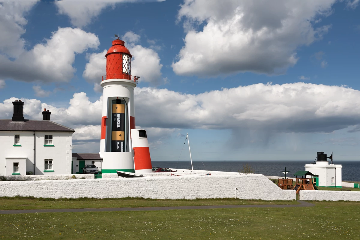This is Souter Lighthouse on the North East coast of England. Built in 1871, it was the first lighthouse in the world designed and built specifically to use alternating current. Its 800,000 candle power carbon arc light ran until 1914 when it was replaced by an oil lamp. It was converted again, in 1952, to run on mains electricity. It ran on until 1988 when it was decommissioned. It is now owned by the National Trust and is open to the public.